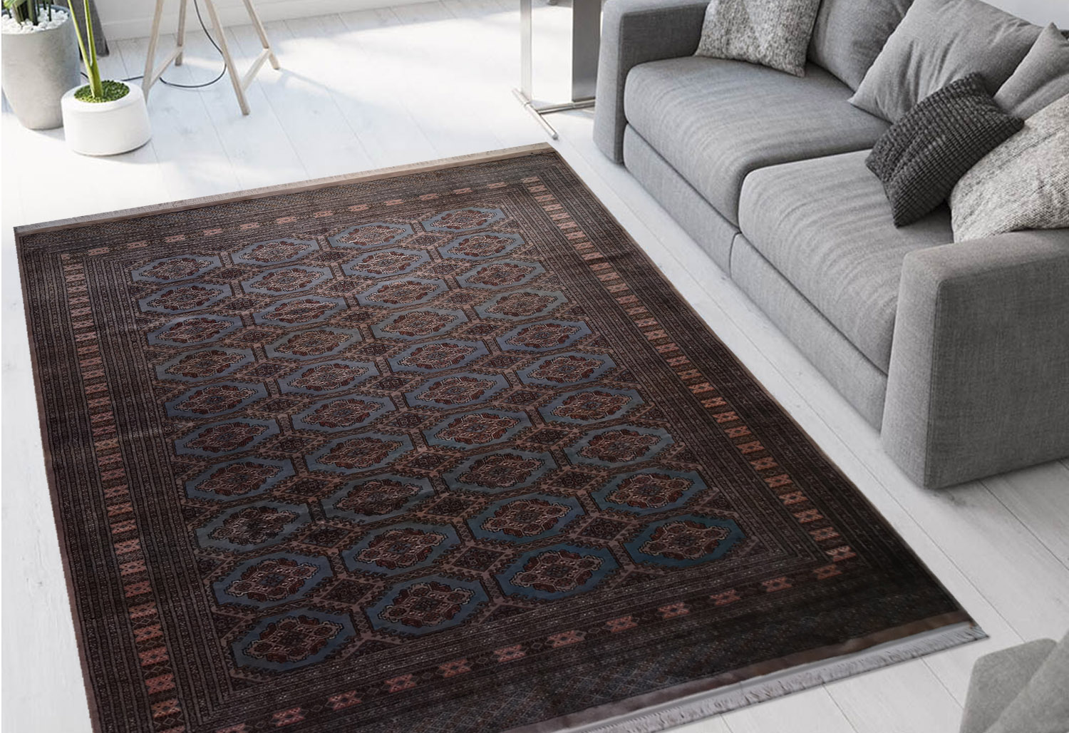Teppich Bukara Kaschmir mit staubblauem Grund, verziert mit einem dichten Gitter aus achteckigen geometrischen Motiven (Gül), die in hoher Symmetrie angeordnet sind.