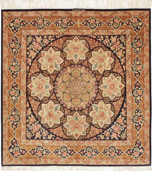 Quom Seiden-Perserteppich von höchster Qualität, mit einem floralen Medaillon-Muster und warmen, harmonischen Farben – typisch für feine persische Handwerkskunst, dekorativ und funktional.