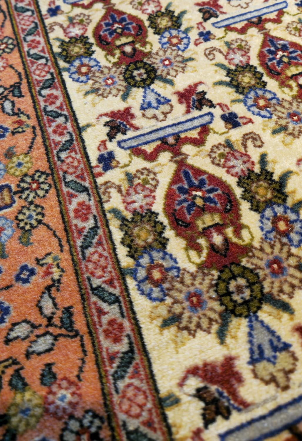 - Waschen:Es wird empfohlen, die Teppiche mindestens alle zwei Jahre zu waschen, damit die Woll- und Seidenfasern stark und widerstandsfähig bleiben und die Farben ihre Brillanz behalten.