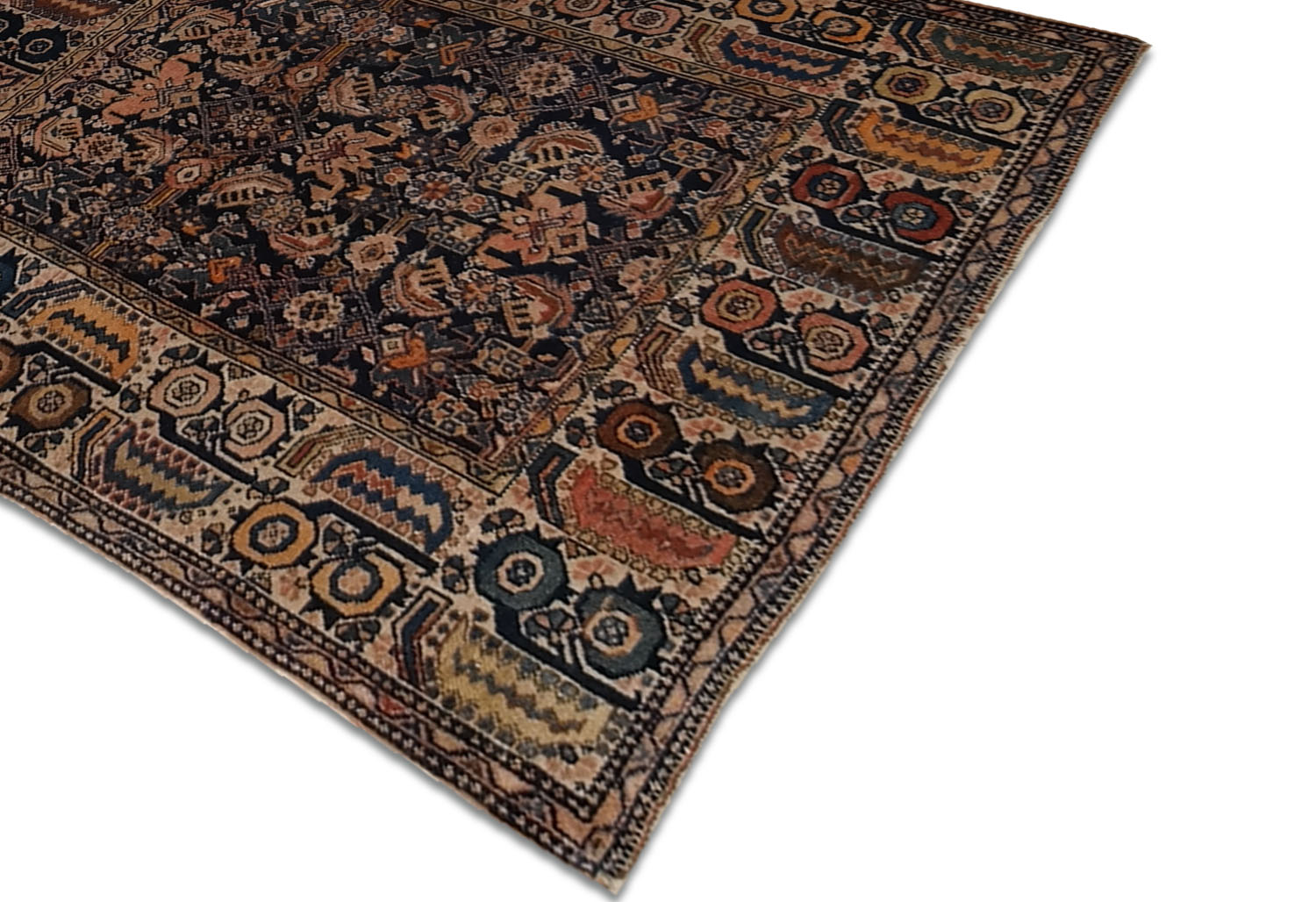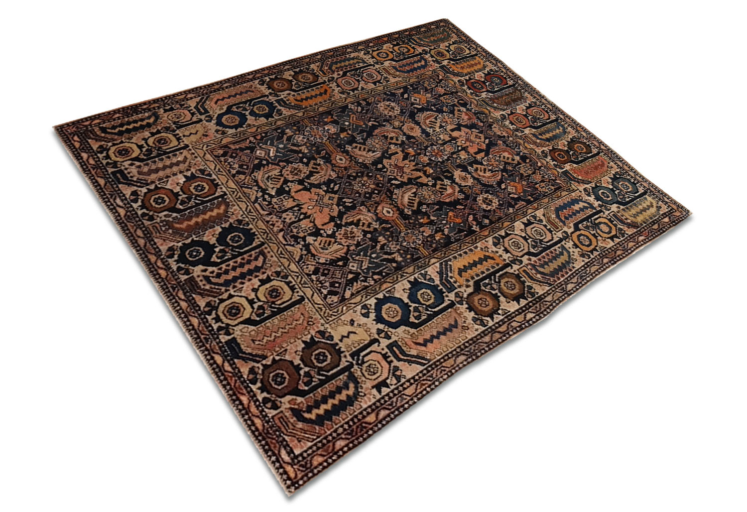 Die Bordüre ist eines der markantesten Elemente: Sie besteht aus einer Abfolge von sich wiederholenden rechteckigen Feldern, die mit Rosetten, Zickzacklinien und Hakenmotiven verziert sind und das Feld mit großer dekorativer Kraft einrahmen. Die Farben, warm und erdig, reichen von Ocker über Rostrot und Braun bis hin zu Dunkelblau, mit elfenbeinfarbenen Akzenten, die alle aus natürlichen, inzwischen prächtig gereiften Farbstoffen gewonnen wurden.