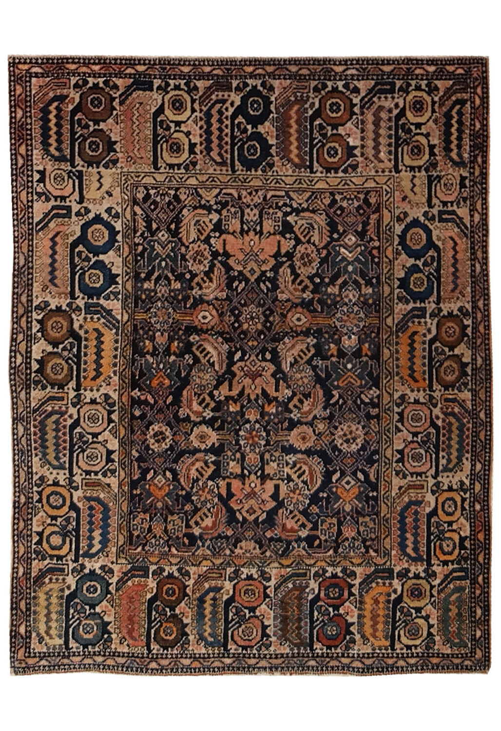 Das zentrale Feld, das auf einem dunklen blau-schwarzen Grund angeordnet ist, ist dicht mit stilisierten geometrischen und floralen Motiven verziert, die symmetrisch entlang der vertikalen Achse angeordnet sind. Rosetten, Rauten und Winkelfiguren wechseln sich ab und erzeugen einen entschiedenen und dynamischen visuellen Rhythmus, der typisch für kaukasische Teppiche ist. Das Fehlen eines klassischen zentralen Medaillons verstärkt den primitiven und grafischen Charakter des Ensembles.